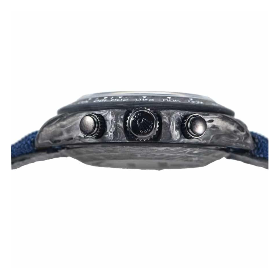 With its robust yet sleek 40.00 mm size and 15.40mm thickness, the Daytona Cosmograph fits comfortably on your wrist, while its scratch-resistant?sapphire crystal?ensures lasting clarity and protection. The fabric bracelet, designed for all sizes, wraps snugly around your wrist, secured by a?904L stainless steel deployment clasp?in matching forged carbon color. As you tighten the clasp, you’ll notice the intricate color fish pattern dial with stick and dot indices come into clearer view, a unique design that sets this replica apart from generic copies.
