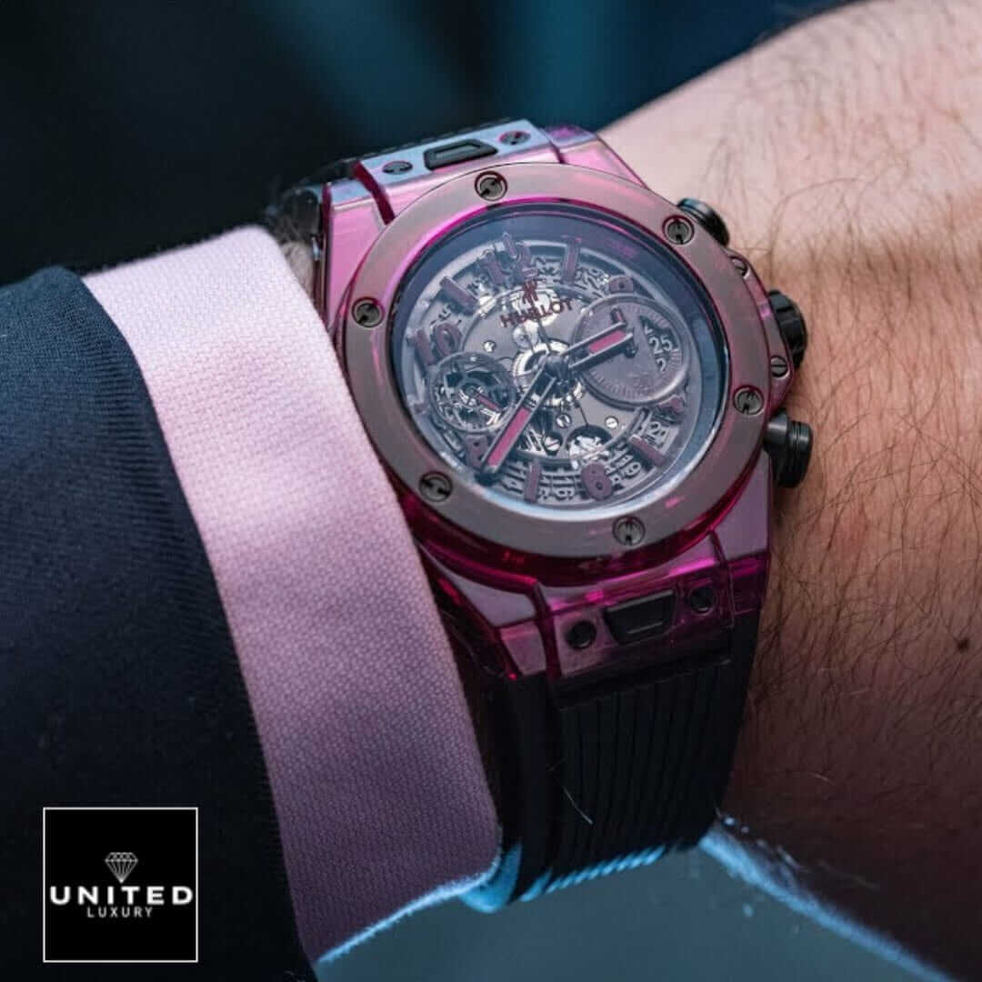 The Hublot Big Bang Unico Red Sapphire 411.JR.4901.RT.1902 Sapphire Replica is a luxurious watch that is sure to turn heads. It features a 45.00 mm resin, sapphire, and gem set case in a striking blue color. The bezel is made of resin and sapphire and is black in color. The crystal is a sapphire crystal for added durability. The bracelet is made of rubber and is adjustable for all sizes. It also features a double-fold clasp made of stainless steel and black in color.